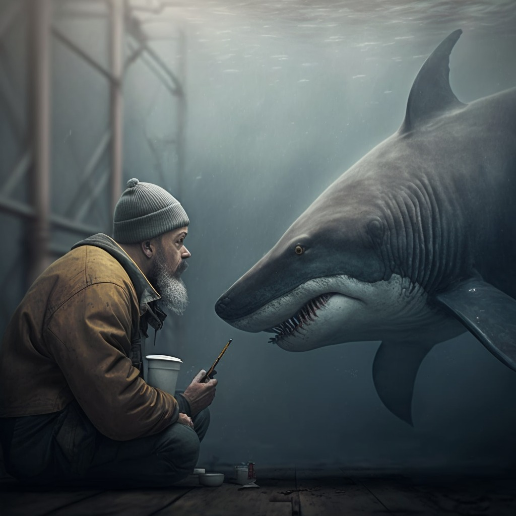 The question was inspired by this AI-created image depicting a grizzly fisherman talking to an equally grizzly-looking shark.