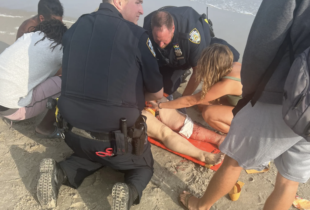 The lifeguards at Rockaway Beach jumped to action and helped Koltunyuk out of the water. According to the chief lifeguard Jose Diaz, “The blood was coming out a lot so they gave her a tourniquet with the buoy, which has a rope, and they tied it so she doesn’t bleed to death.” The 68 year-old lifeguard said that he has never seen something like this in his 50 years on duty. “She lost a lot of blood. The artery came right out. You could see the bones and everything. It was crazy.”