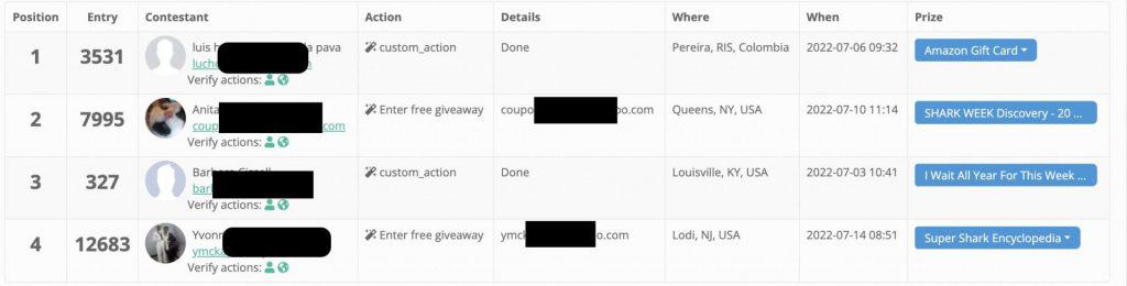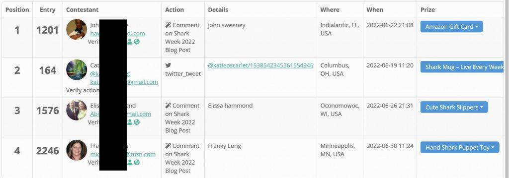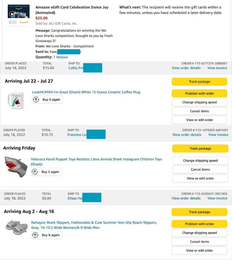 Shark Week 2022 GiveawayImage of the winners on Gleam and Amazon order history showing the gifts sent to the winners.
